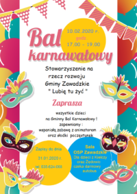 10.02.2020r. o godzinie 17:00 zapraszamy wszystkie dzieci do sali OSP Zawadzkie na "Gminny Bal Karnawałowy"!